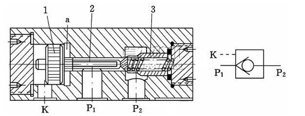 主要用來閉鎖液壓支架立柱千斤頂工作腔中的液體,而使之保持壓力。當液壓支架立柱千斤頂另一腔進液時,同時給該閥的控制腔供液,將閥打開,使液壓支架立柱千斤頂工作腔中的液體回液。